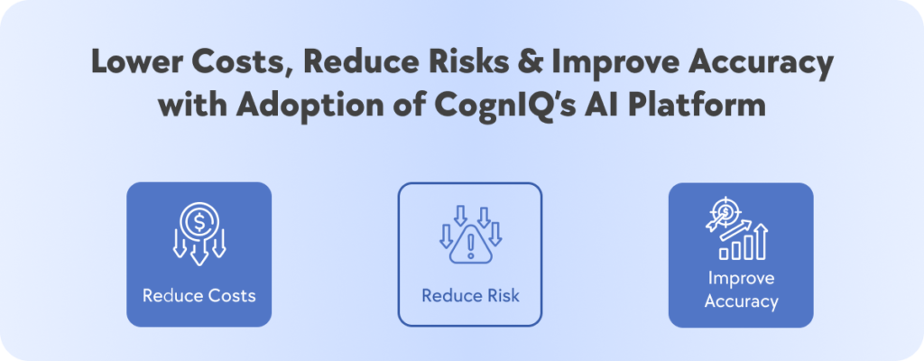 We tailor applied AI solutions to our clients’ needs, ensuring practical outcomes over tech trends. Our expertise in regulatory compliance and industry challenges enhances operational efficiency and drives growth. By managing diverse data, we continuously test and improve our platform for ongoing client advancement. cognIQ broadens access to AI, empowering clients to deliver higher-quality work faster and serve more customers. Our skilled professionals and data scientists refine our AI platform, enabling clients to confidently delegate substantive tasks to AI-based solutions.